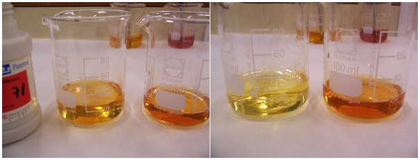 precipitado de Fe(OH)3. El líquido es amarillo (Fe3+). Derecha, disolución original. |